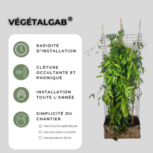 Nous vous proposons aujourd’hui 3 types de végétaux (le lierre, la clématite et le photinia). Néanmoins, vous pouvez commander le module VégétalGab® sans le végétal et intégrer celui qui conviendra le mieux à vos envies et vos contraintes climatiques !